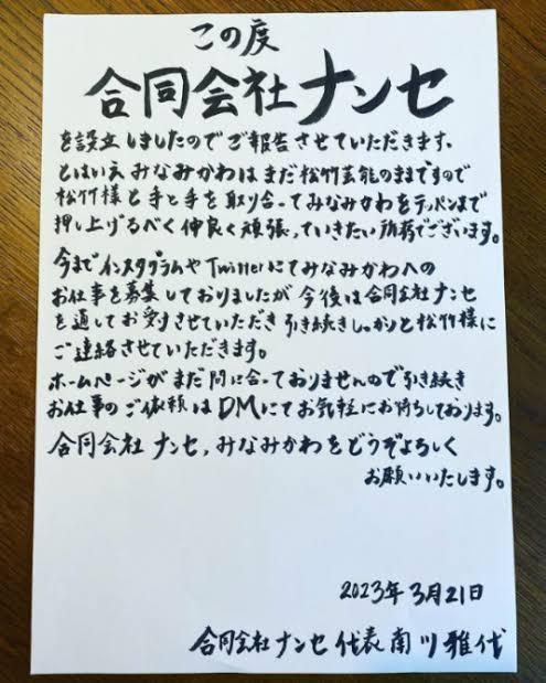 松竹芸能にも、みなみかわの退社について問い合わせたところ、