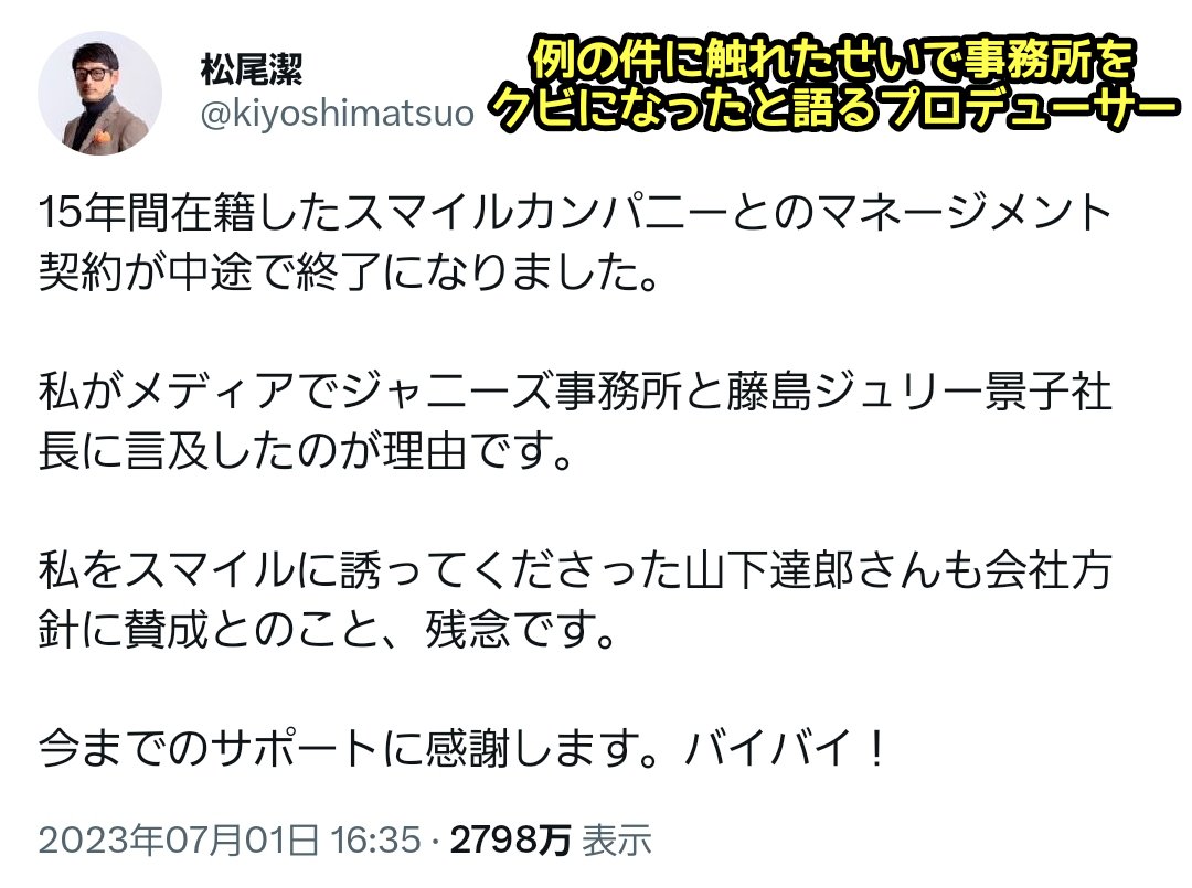 ジャニーズ批判が理由で解除だからこんな事務所もう入られるかってなことだけ