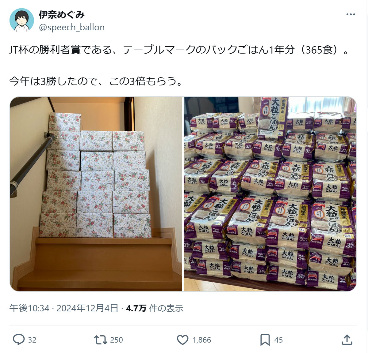 【将棋】渡辺明九段の漫画家妻、1年分パックご飯の圧巻写真を公開「今年は3勝…」夫の勝利者賞