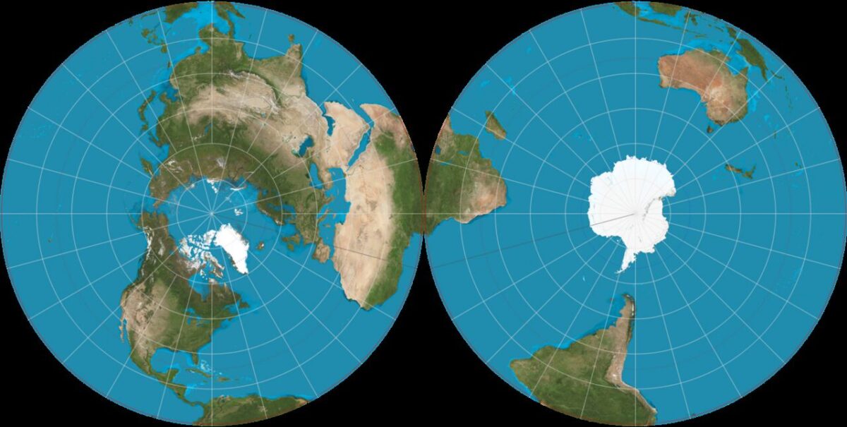 面積比のブレを小さくしつつ距離誤差を最大でも22%に留めるように2021年に考案されたゴットゴールドバーグヴァンダービー両面円盤図法