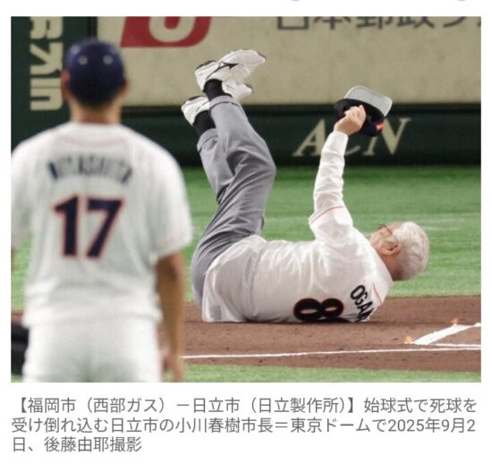 【福岡市(西部ガス)-日立市(日立製作所)】始球式で死球を受け倒れ込む日立市の小川春樹市長=東京ドームで2025年9月2日、後藤由耶撮影