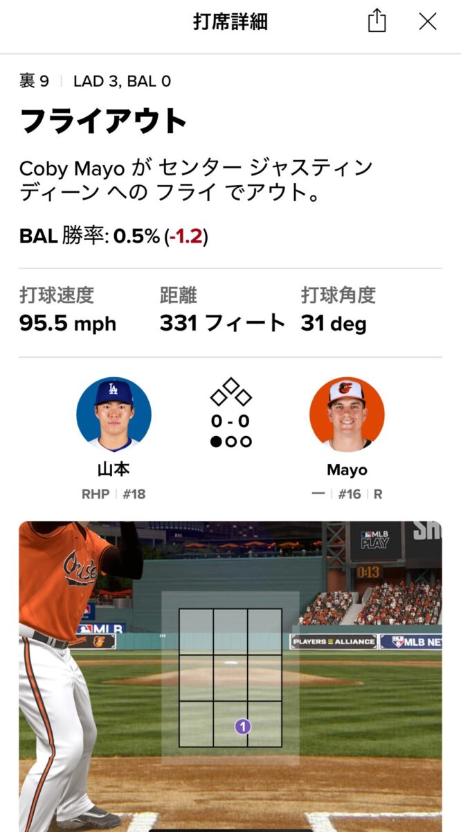 山本が打たれる前はオリオールズが勝つ確率0.4%