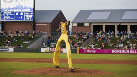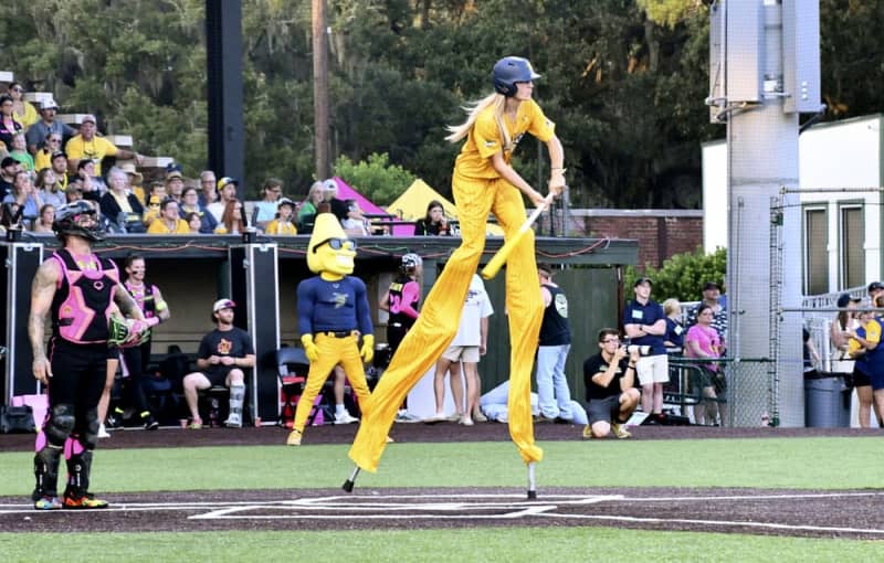 このユニークな野球に、個性あふれる選手が花を添えている。竹馬に乗ってプレーするダコタ・アルブリットン選手は「世界一背の高い選手」。3メートルを優に超える「身長」は他の選手の2倍近く、登場すると観客から大きな歓声を浴びていた。