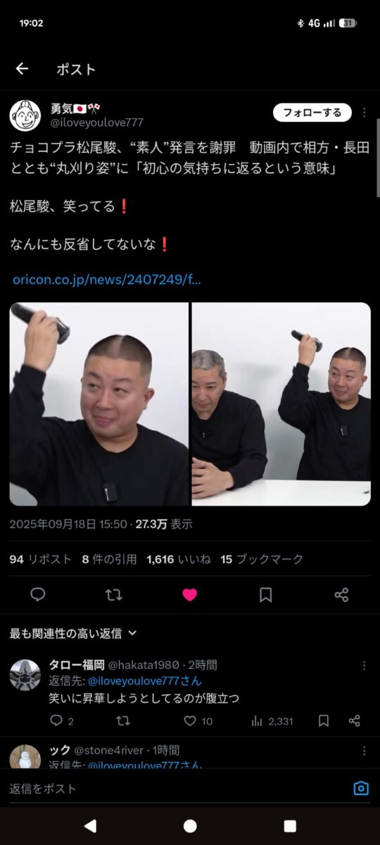 【続報】チョコプラが謝罪丸刈り動画を公開 松尾「芸人なのでボケと(して)」「極端な言い方をしてしまった」「誤解を生んだ」 長田「切り抜かれて拡散された」