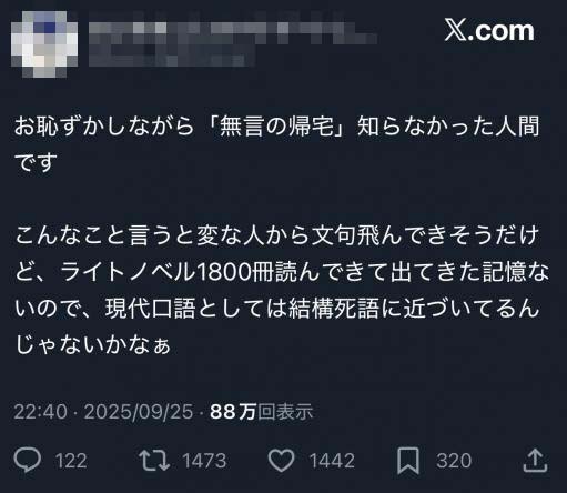 「無言の帰宅」の意味を知らなかった人が、「そんなのわかるわけないじゃん!ふつうに”死んだ”って書けよ!」とか言ってて、ああ、こういう世界で私は小説を書いているのだなあとグッタリした。