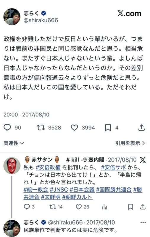 いや、志らくも昔は政権批判したら非国民扱いとか全体主義かよとか呟いてたんだよ。今は180度逆の意見になったみたいだが