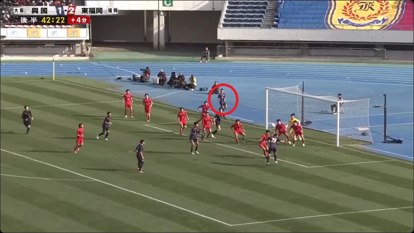 2―1とリードして迎えた後半アディショナルタイム、興国がロングスローからチャンスをつくり、最後はFW笹銀志(1年)が押し込み同点に。だが、笹は明らかにオフサイドの位置にいてその後にシュートを放ったため、東福岡は一斉にオフサイドを主張して猛抗議。しかし判定は変わらず、2―2で同点に追いつかれた形でPK戦に突入し、流れを変えられないまま興国に屈した。