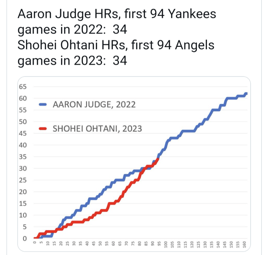 MLB公式は「私たちは再び歴史を目撃している? 驚異的な活躍見せた2022年シーズンのジャッジと同じペースでオオタニは打ち続けている」として成績を比較。昨季のジャッジが本塁打34、打点73、打率.282、出塁率.366、長打率.619に対して、今季の大谷は本塁打34、打点73、打率.301、出塁率.386、長打率.665を記録している。