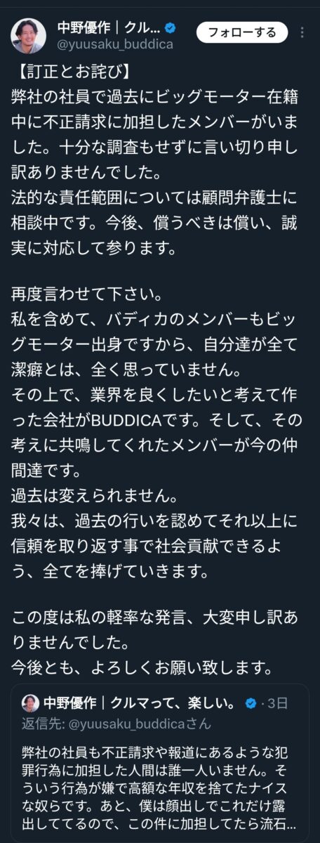 弊社の社員で過去にビッグモーター在籍中に不正請求に加担したメンバーがいました。十分な調査もせずに言い切り申し訳ありませんでした。