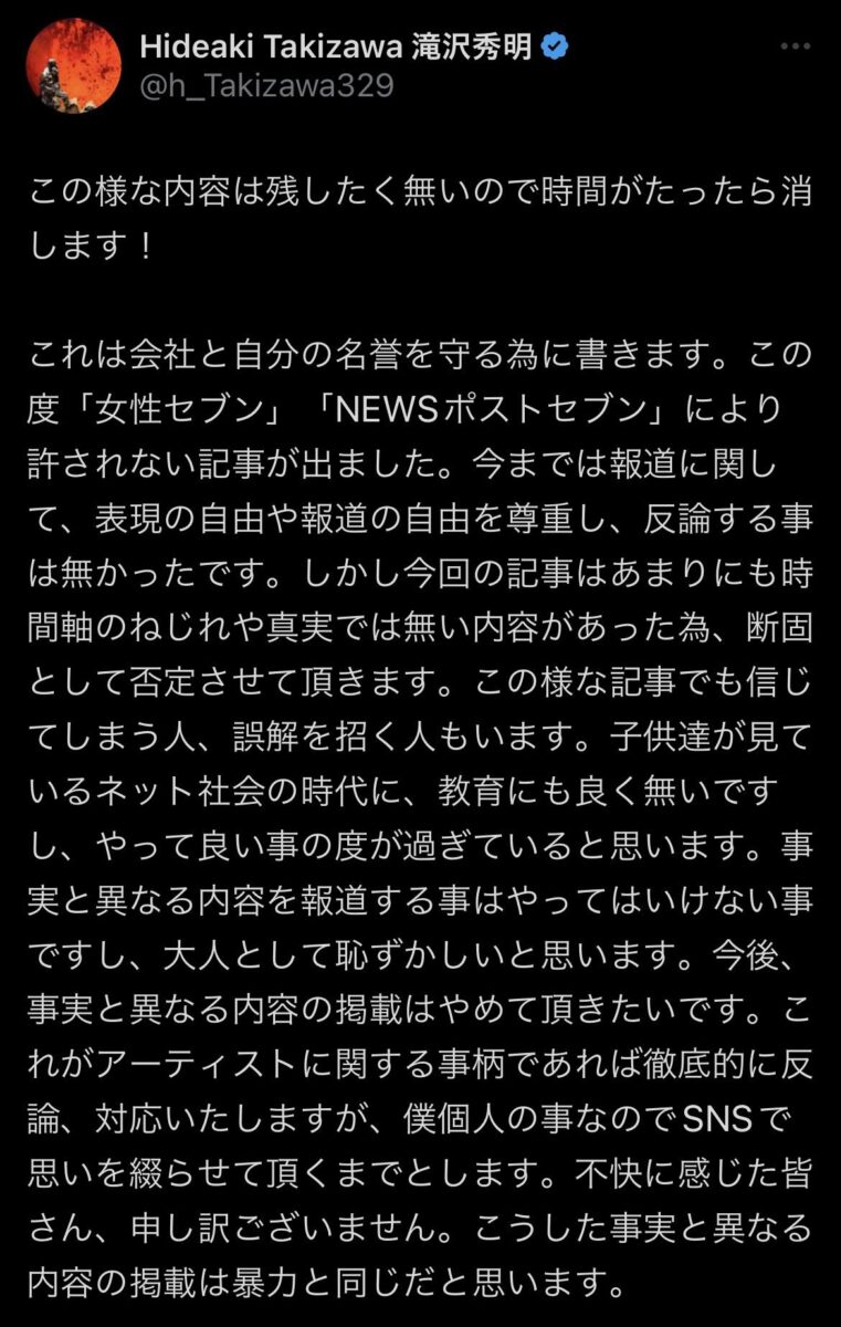※ 滝沢秀明氏「許されない記事が出ました」ジャニーズ所属時のセクハラ報道を強く否定 - モデルプレス