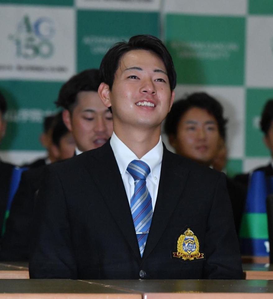 また本拠地・甲子園球場がある兵庫県西宮市で生まれ育った右腕。阪神の指名が読み上げられた直後、青学大では大きなどよめきが起こり、生まれ故郷の球団からの指名に下村は笑みを浮かべた。